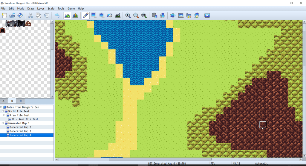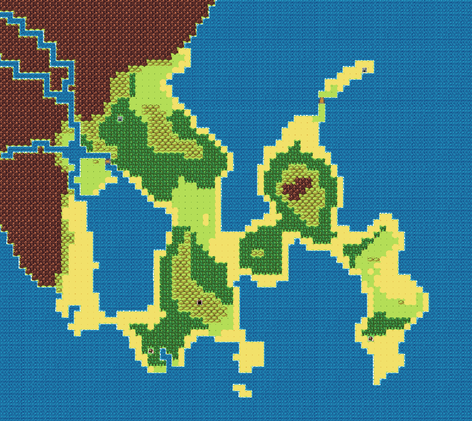 This is what early map generation looked like in RPG Maker’s editor. The screenshot above on the left shows region numbers representing elevation.